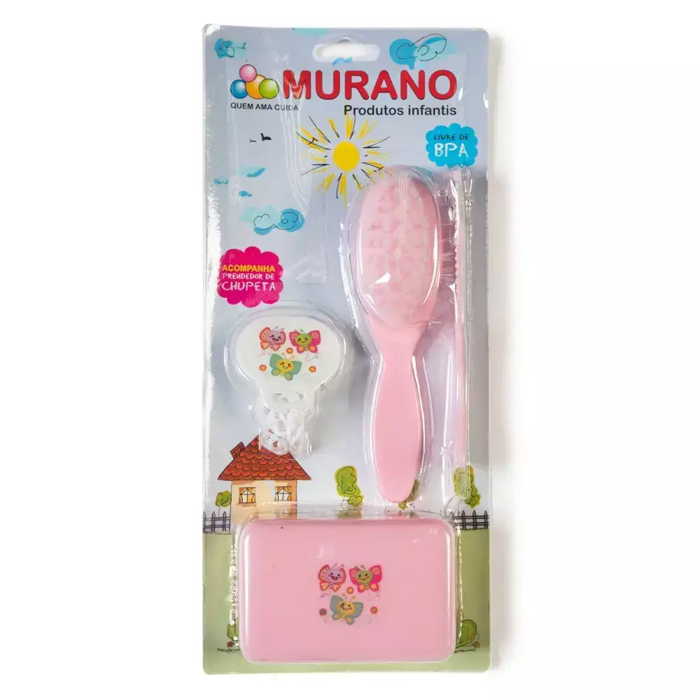 AMOR EM CADA DETALHE A hora do banho vai ficar completa com esse kit super prático e indispensável no enxoval do bebê. Pensando no conforto da mamãe esse kit banho, é composto por: - 1 escova com cerdas de nylon ultra macias e antialérgicas, - 1 pente com bolinhas nas pontas, que massageiam o couro cabeludo, - 1 saboneteira - 1 prendedor de chupeta. Cor: azul, branco ou rosa